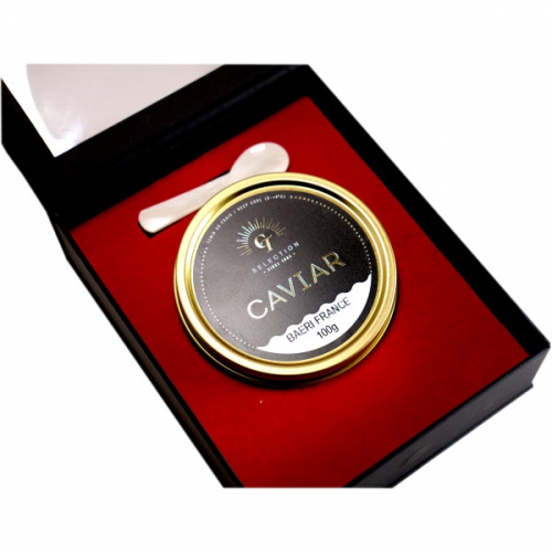 Ce coffret, tel un écrin à offrir ou à s'offrir contient 2 cuillères en nacre naturelle ainsi que 100 gr de caviar Baeri