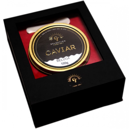 This box contains 2 spoons in natural mother-of-pearl and 100 gr of Beluga caviar.